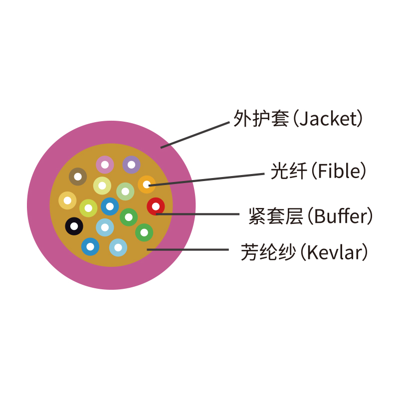 室內光纜是在緊套光纖外均勻增加加強作用的多股芳綸絲,再擠阻燃外護套而成.